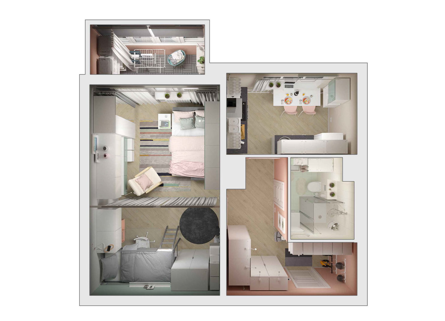 Поскольку лоджию планируется полноценно использовать, сразу предусмотрим там две комнаты — например детскую и кабинет. Конечно, места в этих помещениях очень мало — уместятся буквально кровать и письменный стол, зато они будут изолированными.