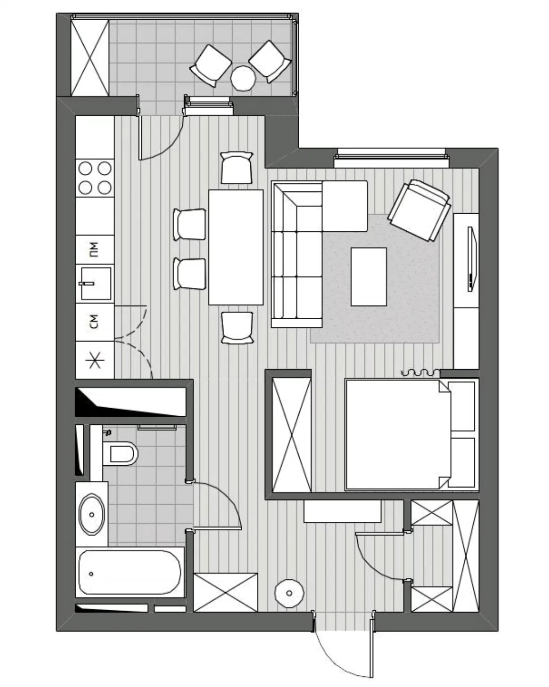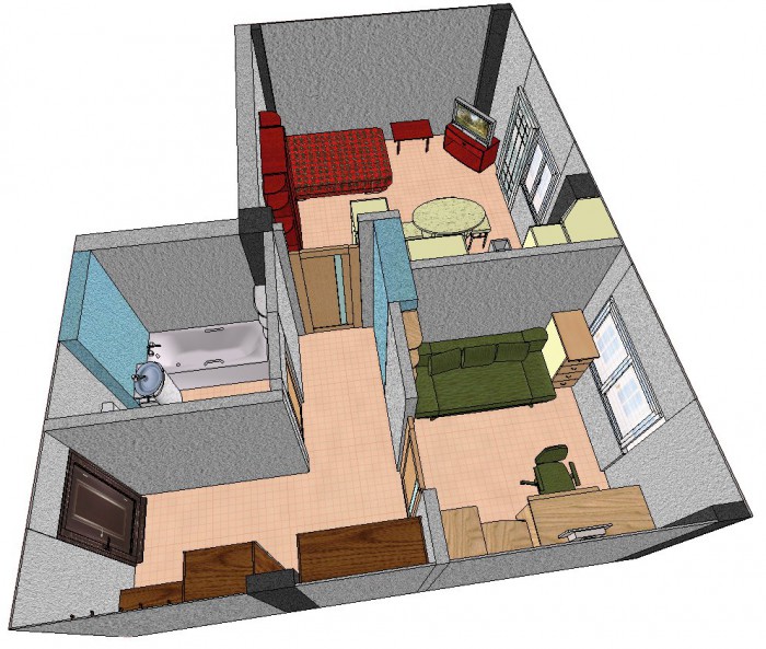 Следовательно, мы предлагаем возвести перегородку на периферии между спальней и гостиной, а также, снести стену (если она не несущая), разделяющую кухню и гостиную. В том случае, если изначально в комнате, кроме выхода на балкон, есть еще одно окно, после возведения новой стены образуется полноценное отдельное помещение. А в кухне-гостиной сохраниться объем и функциональность, бывшие при предыдущем варианте планировки
