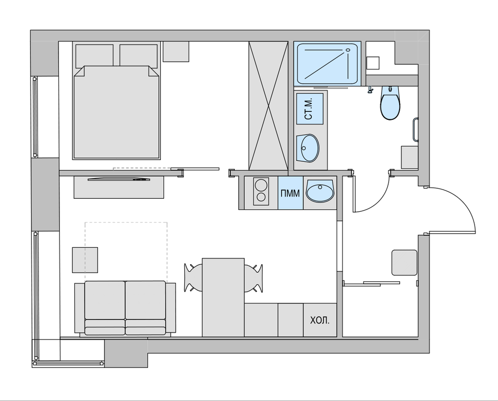 Площадь «однушки» — всего 37,5 кв. м. А уместить хотелось спальню, детскую, кухню и гостиную с дополнительным спальным местом для родственников, которые периодически приезжают погостить. Выручило то, что плита на кухне электрическая, а в прихожей была ниша. На эту нежилую площадь и была перемещена зона готовки, причем вполне законно.