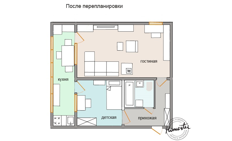 Наконец, самая интересная, но и самая сложная в реализации перепланировка — перенос кухни в коридор и присоединение к гостиной. При согласовании зона готовки будет называться встроенным шкафом, а спальня родителей всё так же будет считаться кухней. Зато все помещения окажутся максимально просторными.