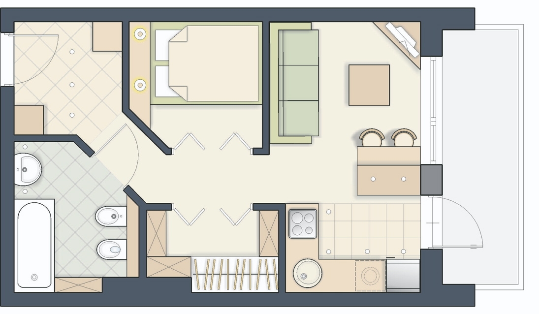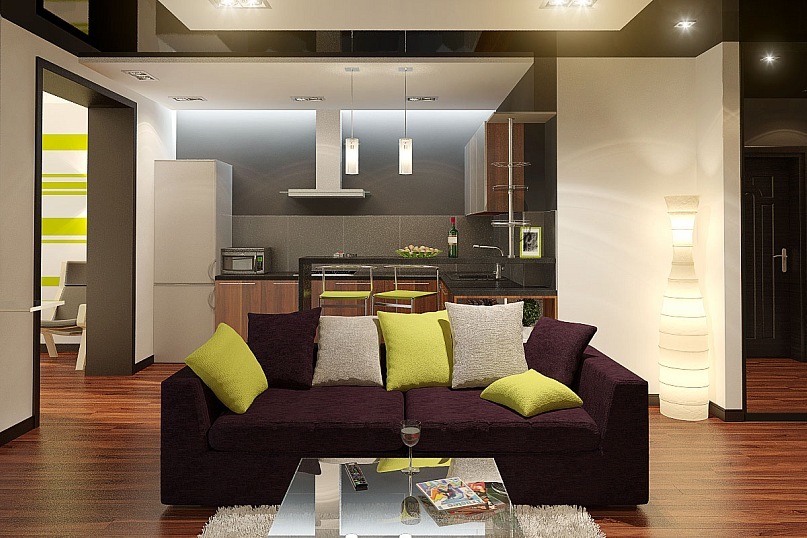 Если в квартире достаточно большая кухня, можно разделить ее на две зоны: кухни и гостиной. Про это у нас даже есть отдельная статья. Зонирование в таком случае можно сделать визуально: цветом, разной отделкой пола и стен. Квартиры с такой планировкой сегодня все больше завоевывают российский рынок недвижимости и называются евродвушками. Эта идея не нова и появилась в Западной Европе еще в 1970-х годах. Тогда такие квартиры позиционировались как жилье для молодых одиноких людей и студентов.