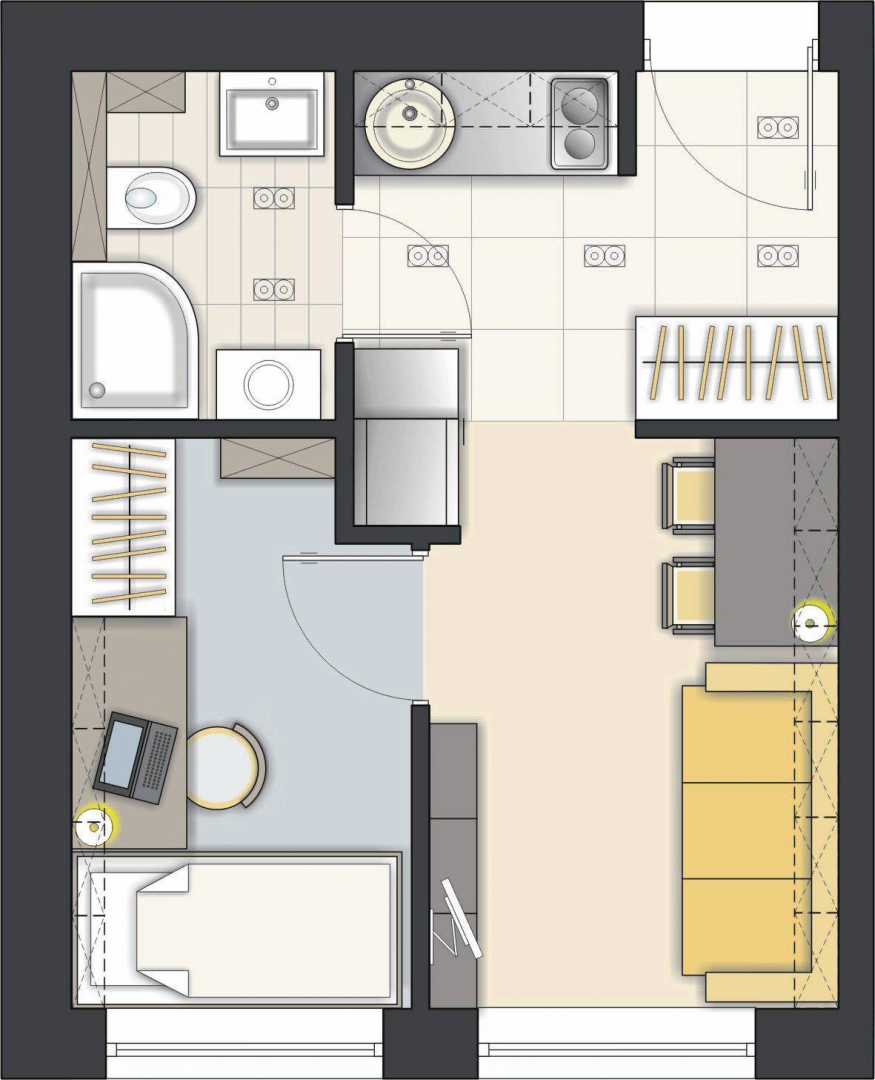 Работать с ограниченным пространством дизайнерам интерьеров тяжелее всего. Чем меньше помещение, тем важнее соблюдать правила эргономики, чтобы жильцы не натыкались на мебель и чувствовали себя комфортно. Кажется, что в «однушке» поместится только кухня-гостиная и спальня — для большего функционала просто нет места.