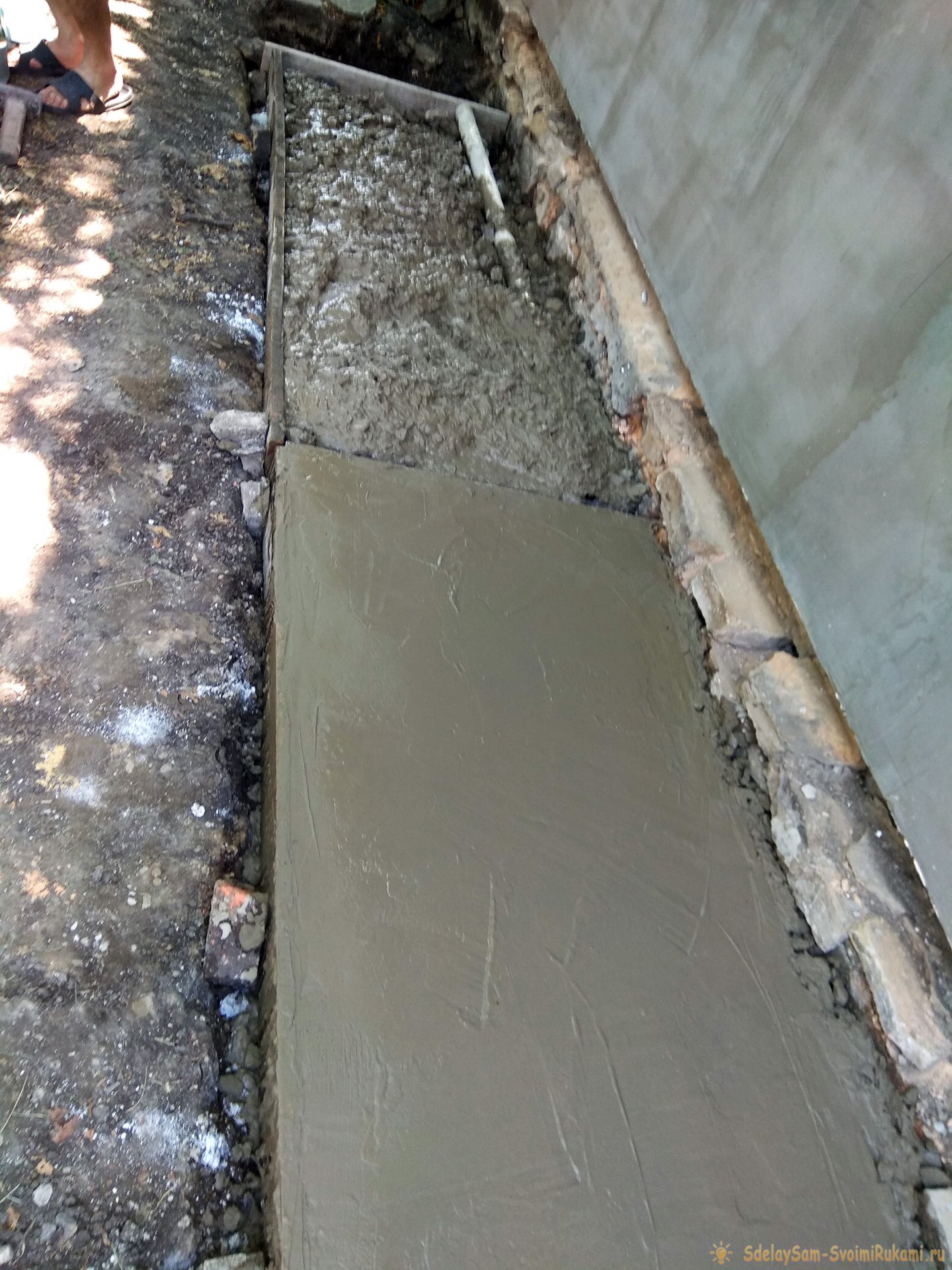 После предварительного высыхания гладильную смесь насыпают на поверхность от основания наружу, а затем выравнивают широким шпателем в продольном направлении. Слой железа должен быть не менее 1,5–2 мм, время застывания смеси – не менее 3 суток с периодическим увлажнением поверхности. Правильная отмостка — не мелочь