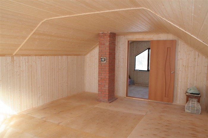 Таким образом выглядит обшитое вагонкой помещение мансарды