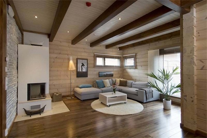 Выбирая натуральное дерево для оформления и стилизации гостиной, не обязательно использовать только этот материал. Выгодно смотрится комбинация отделки мансарды вагонкой и обоями, вариант немного облегчает комнату, прост в монтаже и недорог. По завершении работ со стенами, остается выполнить работы по устройству пола и потолка. Пол будет выгодно смотреться в дереве: паркет или крашеная доска, потолок дает гораздо больше вариантов выбора. По желанию это может быть краска, обои, натяжной потолок или дерево, как и в случае со стенами.