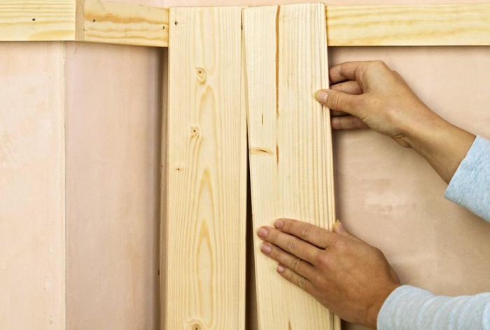 Для вертикального крепления панелей, создающего иллюзию более высокого пространства, нужна обрешетка. Она сколачивается из горизонтальных брусков, удаленных друг от друга на 50 см. Размер сечения элементов обрешетки составляет, как правило, 15×45 мм.