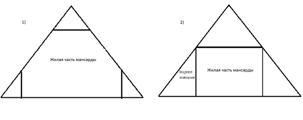 Второй способ более традиционный. Комната получается прямоугольной или квадратной. Благодаря высоте и ширине крыши, вы можете сделать дополнительные перегородки, чтобы создать идеальную форму, как это видно на схеме выше. Отрезанное пространство сгодится под складское помещение. Такое лишнее место никогда не будет мешать и найдет свое применение.