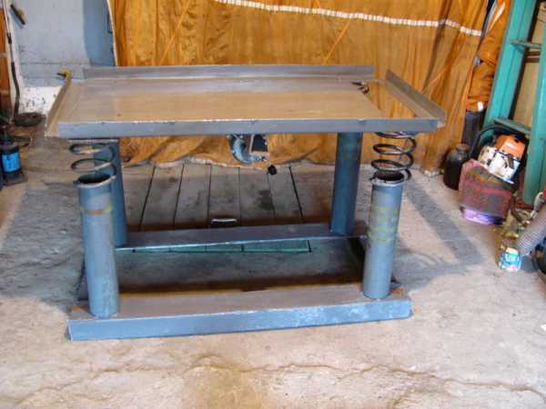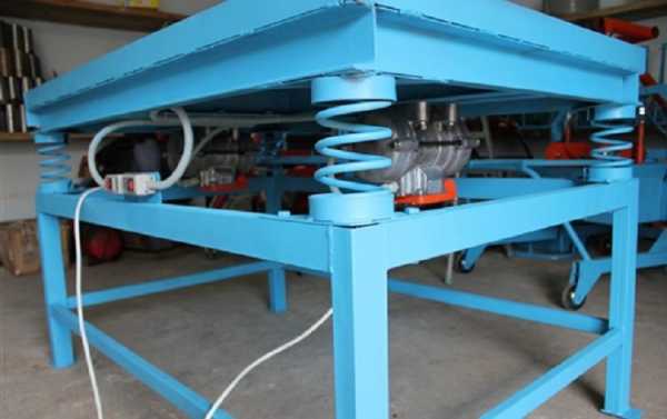 - Во-первых, нужен будет вибростол для заливки/выбивки. Чтобы не приобретать для разовых задач дорогостоящее оборудование, изготавливают простые вибростолы из станины с присоединённым подвижным столом с вибратором (применяют обычный старенький моторчик от стиральной машинки или аналогичного устройства).