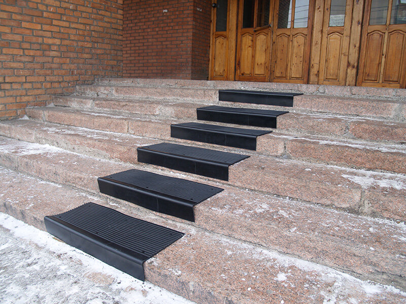 - Универсальный вариант покрытия для любой лестницы на улице в виде накладных резиновых ступеней из прессованной резиновой крошки;