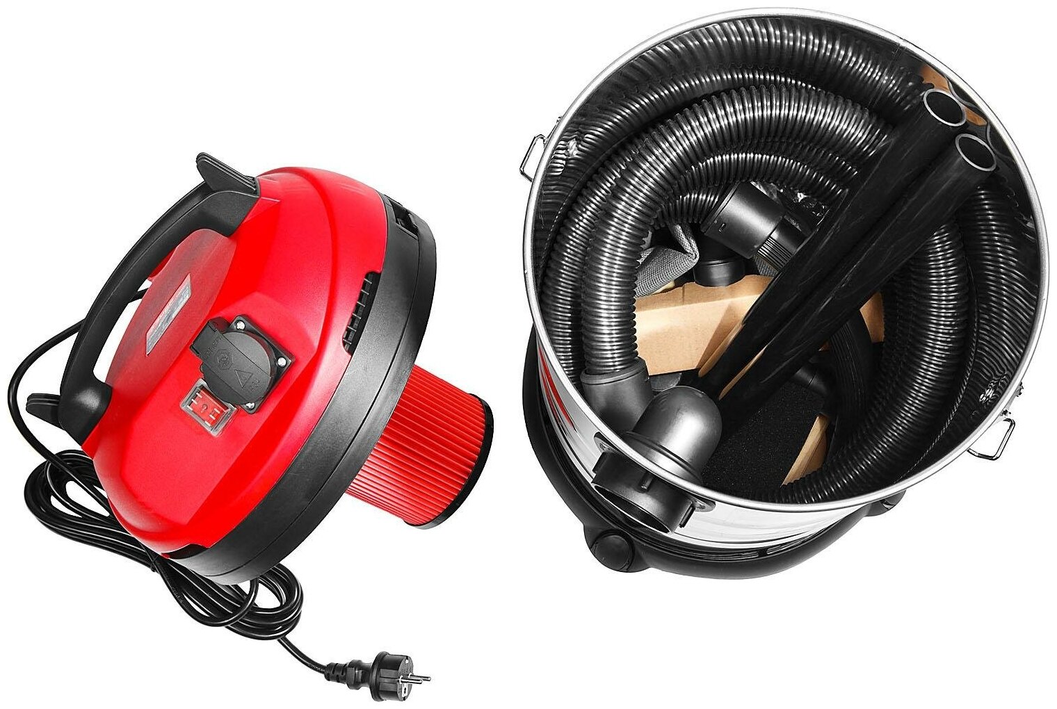 Мощности в 1000 Вт хватит для уборки даже относительно тяжелого загрязнения. Сила всасывания может создавать вакуум до 21 кПа. На ручке шланги есть механический регулятор, способный контролировать мощность потока воздуха. Строительный пылесос отлично работает в паре с рабочим инструментом, можно подключить штроборез.