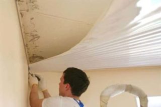 - Укрепление поверхности базового потолка. Подобные действия предотвратят осыпание на натяжной потолок старого слоя штукатурки.